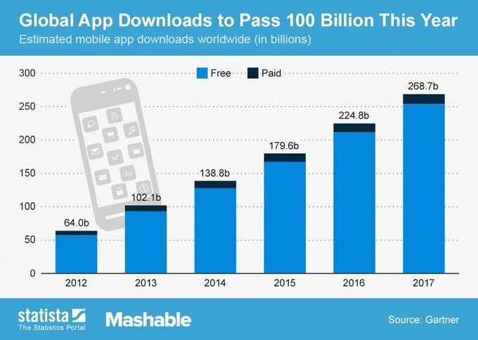 By the end of 2013, the total count for mobile apps downloaded will reach 102 billion, according to projections. That number pales in comparison to the number of app downloads expected by 2017: more than 268 million